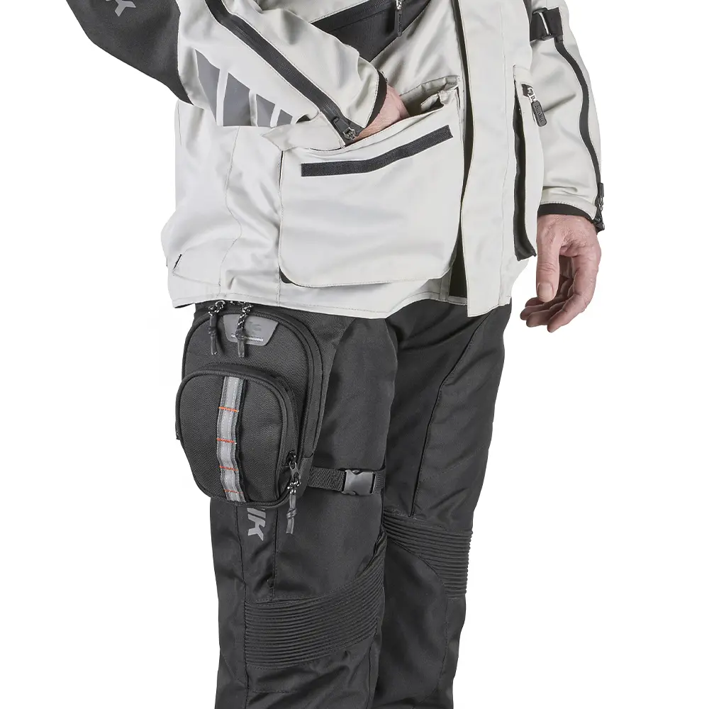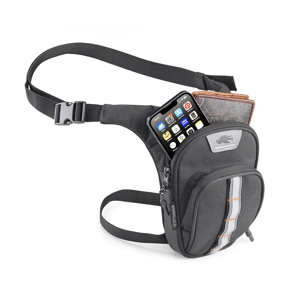 STO105 K’STORMER je kompaktna i praktična moto torba za nogu (leg bag), idealna za sigurno nošenje osnovnih stvari tijekom vožnje. Zahvaljujući podesivim remenima za pričvršćivanje na bedro i struk, torba pruža stabilnost i udobnost bez ometanja tijekom vožnje.